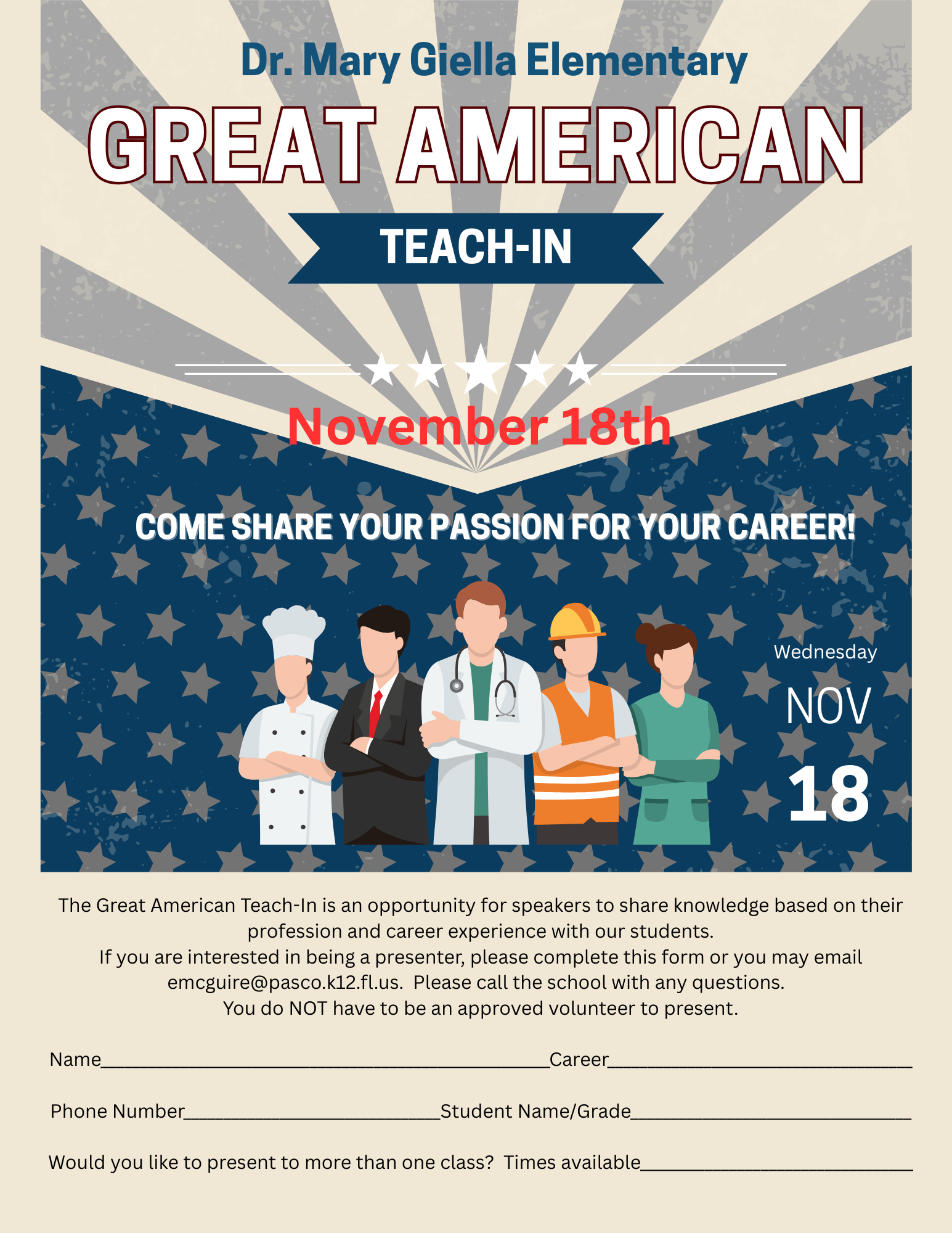 If you have a passion for your career and would like to share it with our students, please get in touch with Mrs. McGuire. We would love to have you come and teach our students about all the possibilities they have for a future career.