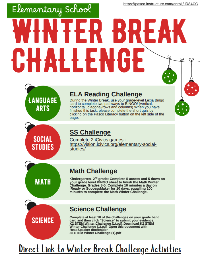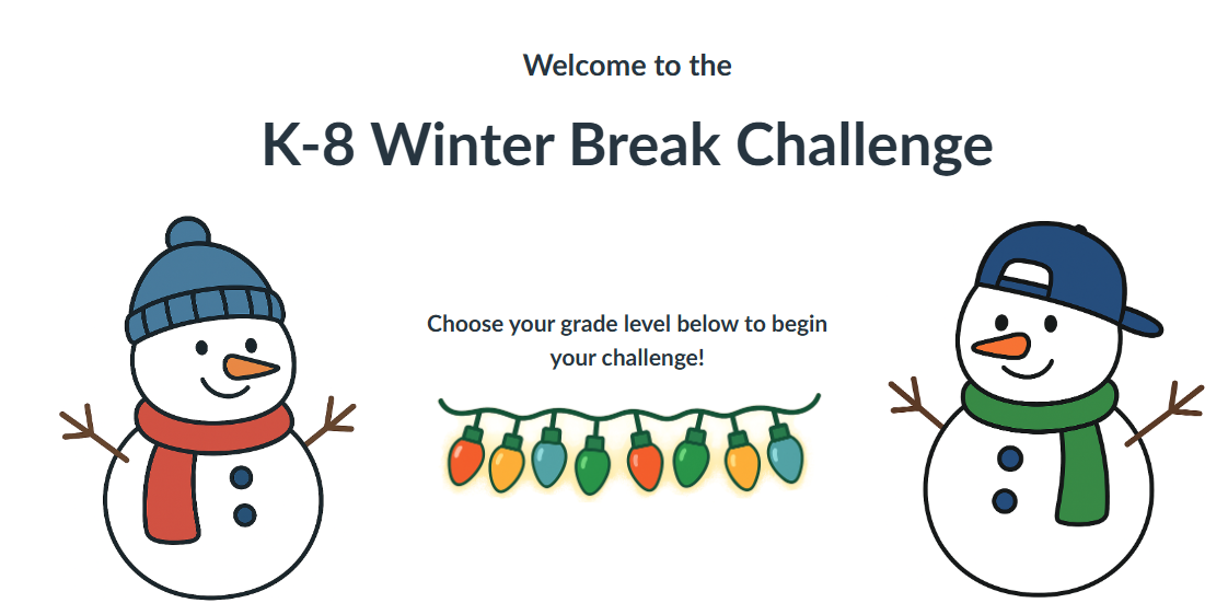 We are excited to announce the K-8 Winter Challenge! This initiative is designed to engage students and families in fun, educational activities during the winter season. Please encourage participation and celebrate student efforts as they complete the challenge.